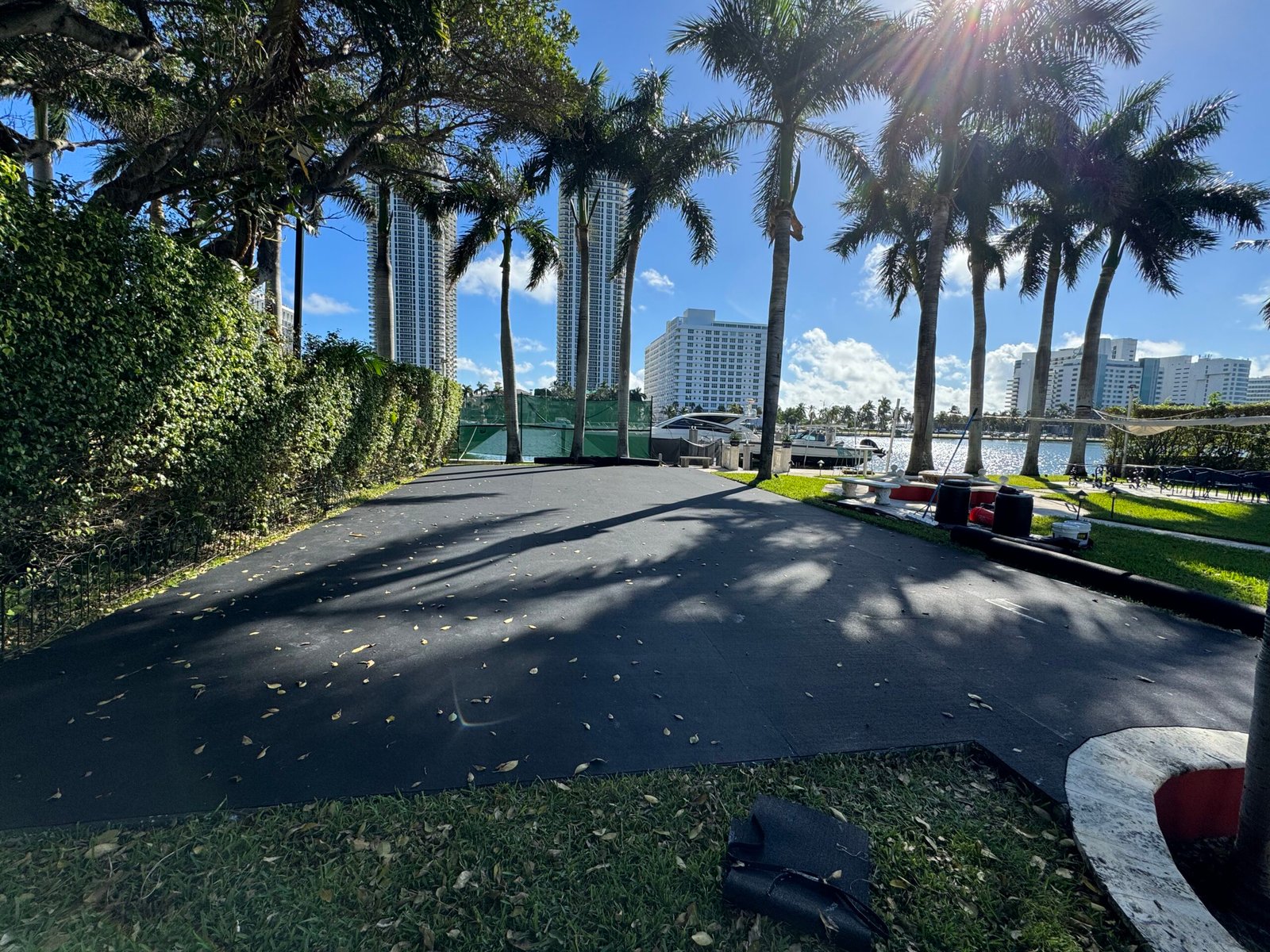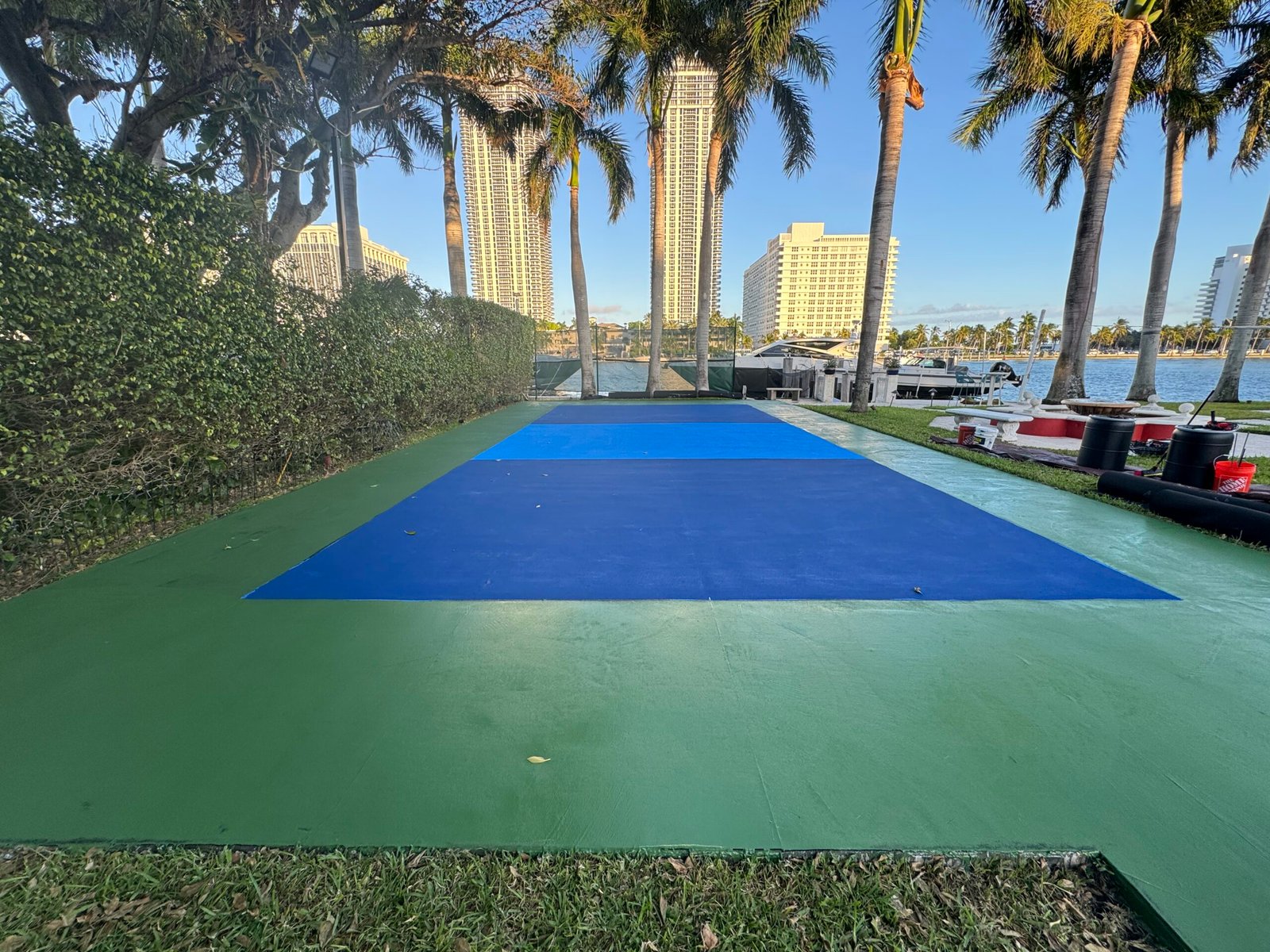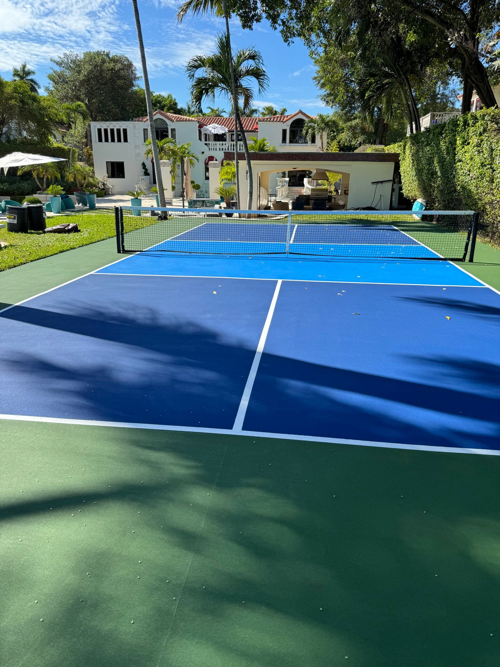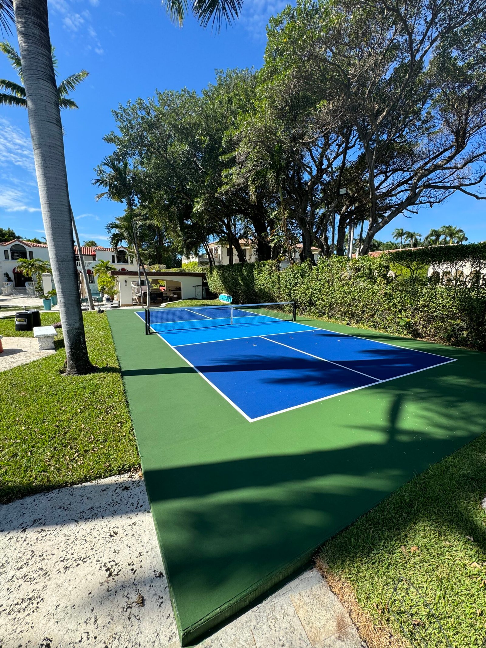 The project involved resurfacing and color design of a custom backyard pickleball court for a Miami residence.