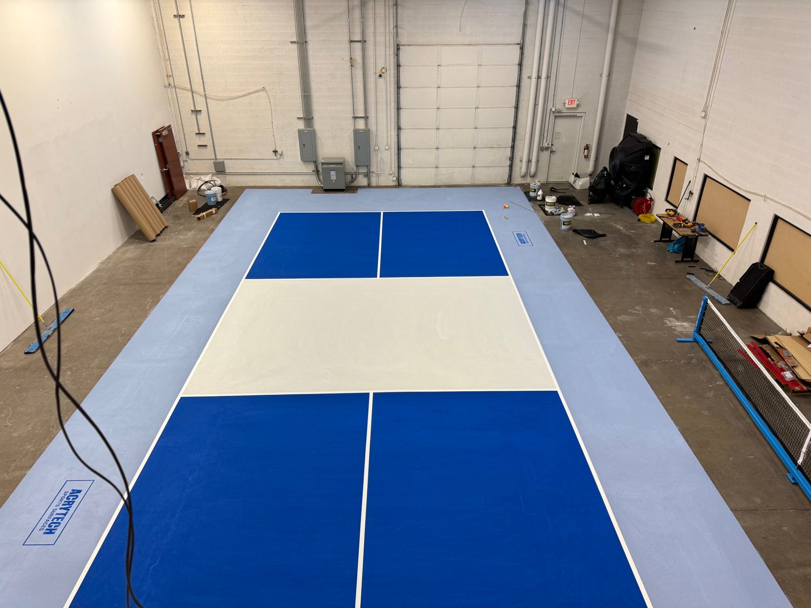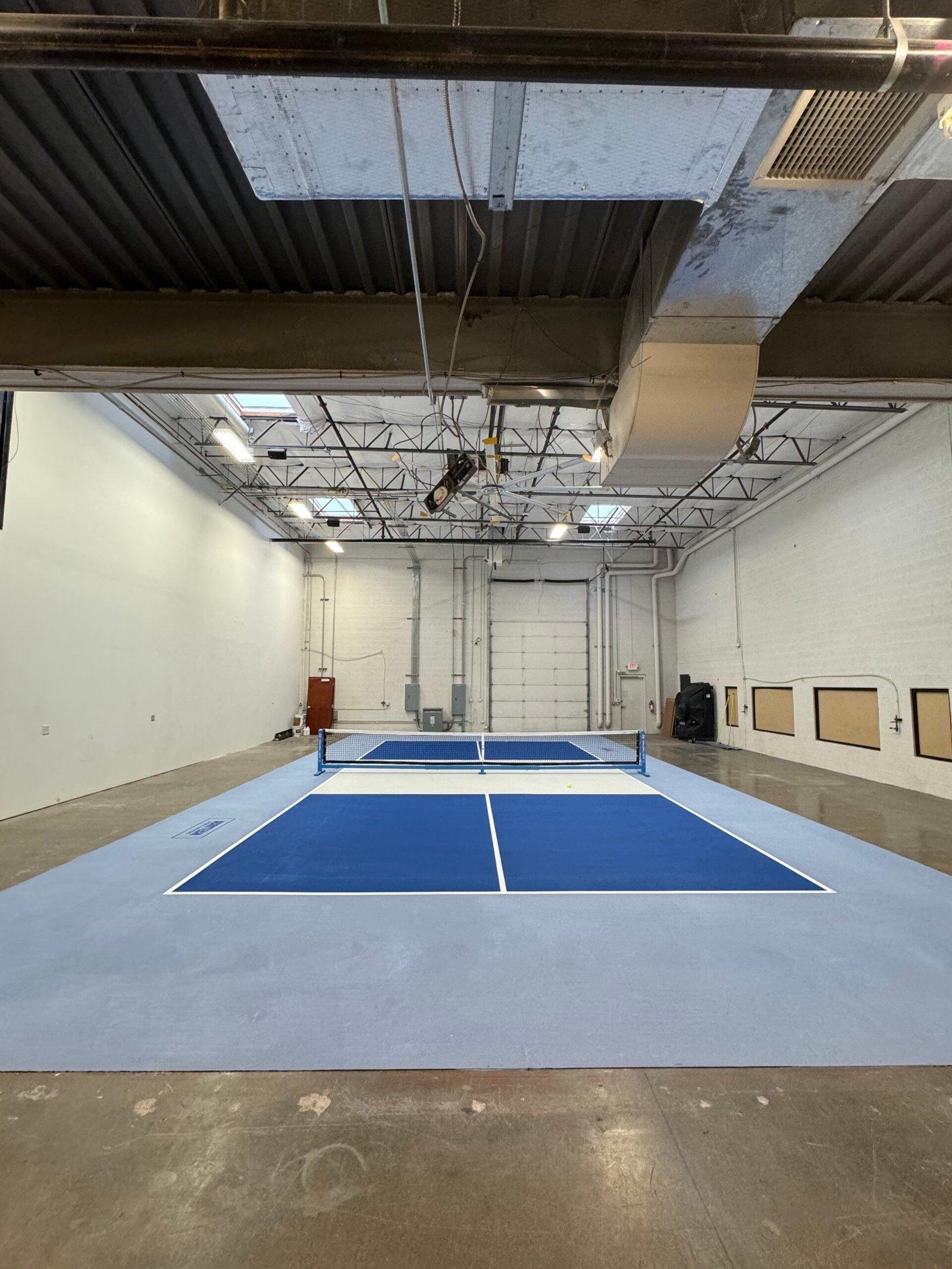 The project involved designing and installing an indoor pickleball court system in a converted warehouse. The team handled surface preparation, leveling, and application of acrylic coatings with custom color zones.